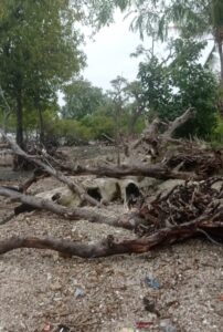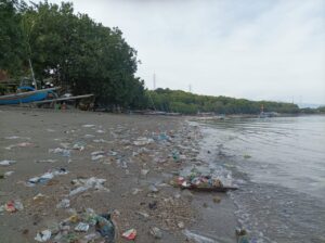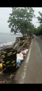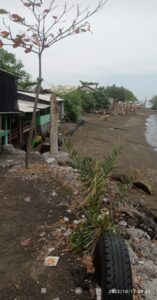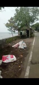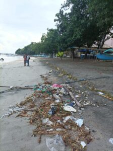 Sampah-sampah sebelum berlabuh dipantai pasir putih melewati area ini sampah plastik nya nyangkut di terumbu karang, nanti Ibu. Kabid kami kirimi foto terumbu karang yg banyak sampah plastik nya, hari minggu lalu kami dan team mau mengambil gambar bawah laut airnya keruh jadi hasilnya kurang bagus. Selain pesisir pantai banyak sampah juga sepadan jalan pantura jalan nasional plengsengan banyak yg rusak, karena bila air laut pasang air laut akan naik ke jalan dan kembali lagi ke laut melalui celah-celah Plengsengan pinggir jalan (tepi pantai).