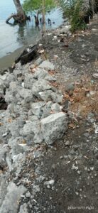 Tampak plengsengan Wisata Batu kenong yg hancur. Di belakang bangunan / sebelahnya banyak pohon mangrove yg mati. Bila bangunan ini menjorok ke laut dan dekat dengan tumbuhan pohon mangrove maka perkembangan mangrove terganggu, tunas-tunas Baru tdk akan muncul lagi karena area lahan mangrove berkurang/terdesak oleh bangunan yg menjorok ke laut. Bagaimana dengan bangunan ini apa sdh memiliki ijin lingkungan dan UPL UKL?
