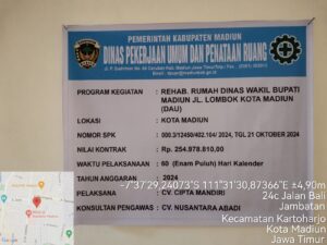 Madiun, Selasa, 17 november 2024 – Pemerintah Kabupaten Madiun melalui Dinas Pekerjaan Umum dan Penataan Ruang (PUPR) melaksanakan rehabilitasi Rumah Dinas Wakil Bupati yang berlokasi di Jalan Lombok, Kota Madiun. Proyek ini merupakan langkah strategis untuk menjaga kelayakan dan kenyamanan fasilitas rumah dinas sebagai salah satu aset penting Pemerintah Kabupaten Madiun.