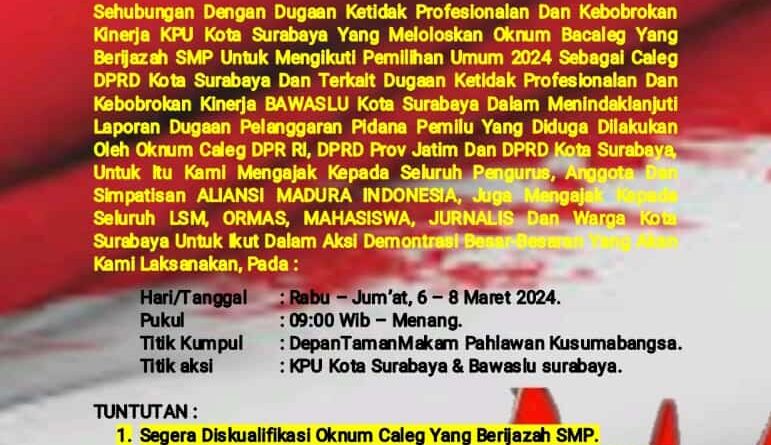 SURABAYA, – Aliansi Madura Indonesia (AMI) kecewa dan Geram melihat kinerja KPU Kota Surabaya dan Bawaslu Kota Surabaya yang terkesan